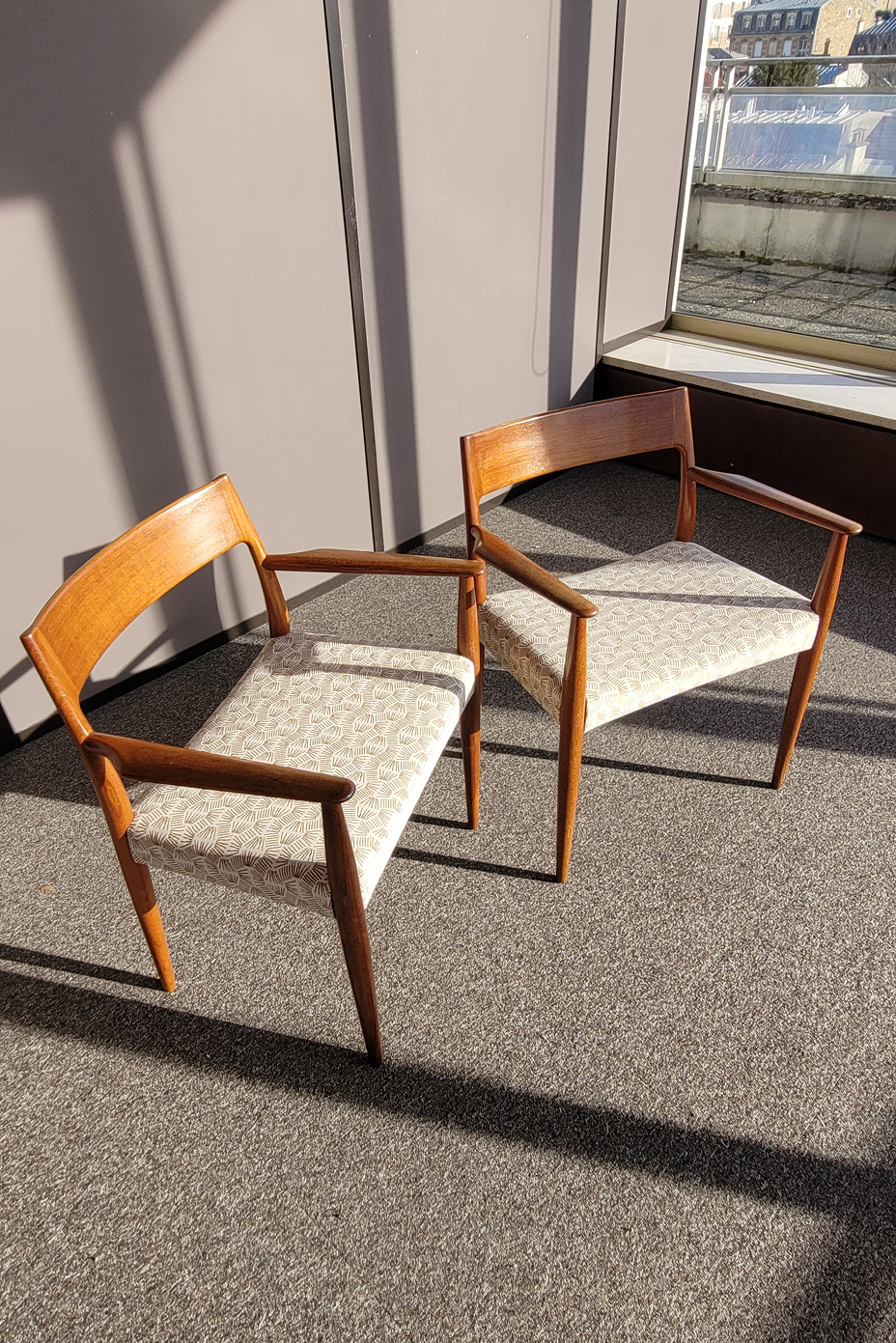 Deux fauteuils danois issus du même ensemble, avec accotoirs. Même travail de restauration : patine, mousse Bultex fine, et pose du tissu Nobilis